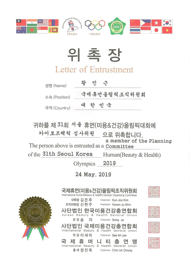 국제 휴먼 올림픽 조직위원회 카이로프랙틱 심사위원 황인근 협회장님