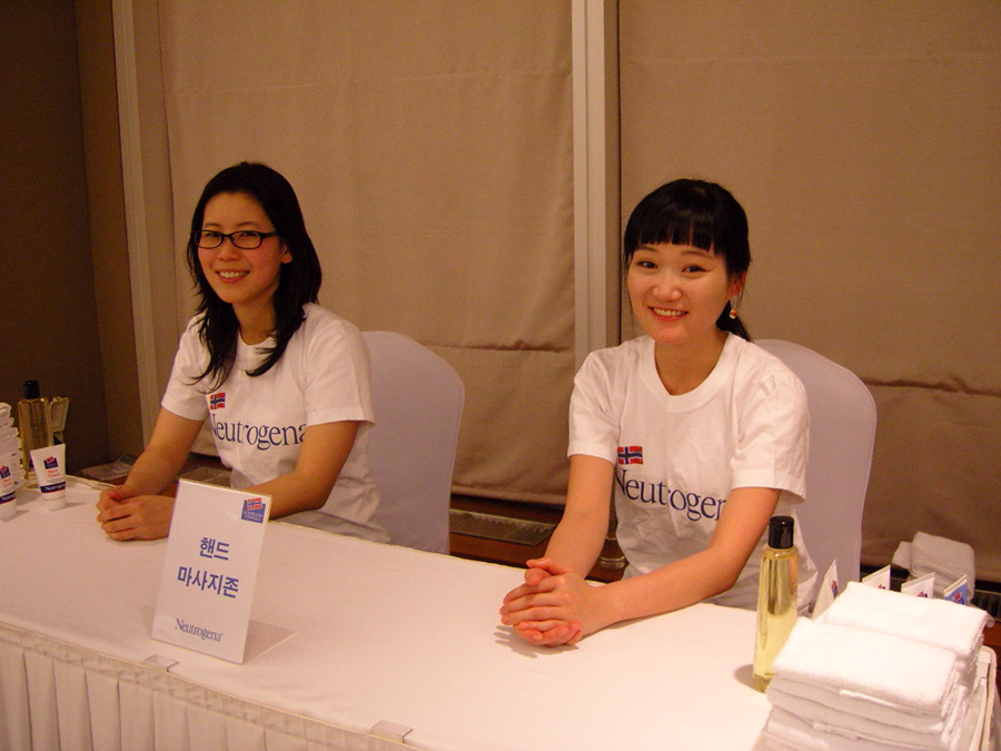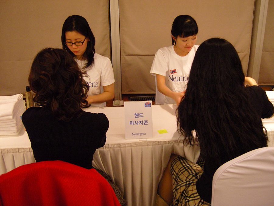 뉴트로지나 스킨케어 행사장, 환한 미소로 대기중인 SMC아카데미 수강생 팀원!! 마사지존~