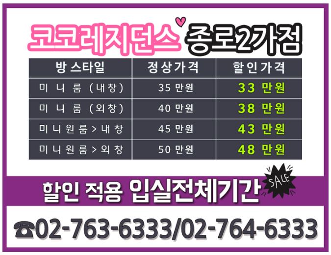 위치적 조건이 매우 편리한 종로고시원 코코는 지하철 3호선 종로3가역 / 1호선 종각역과의 근거리에 위치!! 근처 수도권 이동이 용이한 노선을 비롯해 다양한 버스정류장도 있습니다!! 꿀TIP : 입실원의 90% 정도가 각종 시험을 준비 하시는 분들이라는 점 집중력, 편안함 을 유지할수 있는 공간확보 보증금 없는 월세 선불형 입실제도까지 부담감 DOWN 장기투숙자 환영 안락한 내 집같은 주거환경을 자랑하는 코코레지던스!! 모든 방의 기본 옵션으로 넉넉한 침대, TV겸용모니터, 책상&의자 개인냉장고, 옷장 등의 생활시설이 마련되어있습니다. 미니룸과 미니원룸 형태의 방구성으로 원룸스타일은 개별 욕실이 함께 있습니다. 각 방마다 케이블TV + 초고속 인터넷 설치가 되어 무료로 사용가능!!갭개별 와이파이 세련된 인테리어로 시선을 사로잡고, 24시간 개방되어 있어 개인생활 패턴에 맞춰 식생활 하실 수 있습니다. 라면, 커피 등이 구비되어 있고 냉장고 / 인덕션 / 정수기 / 전자레인지 등의 가전과 양념류, 조리기구 등이 준비되어 있습니다. 365일 안심하고 생활할 안전환경을 위한 24시간 상시 근무하시는 관리자 분이 CCTV녹화 운영은 물론 현관 도어락 설치로 외부인 단절OK !! 화재예방에도 철두철미 합니다. △ 할인 이벤트 금액표 △