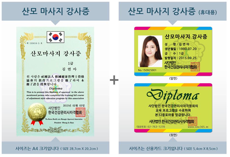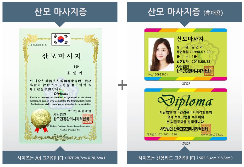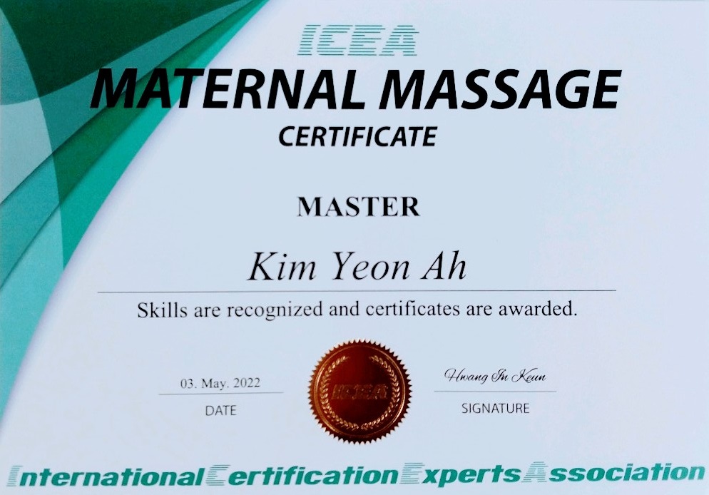 산모마사지(전신), 통곡마사지 교육 후 발급받는 자격증서입니다.