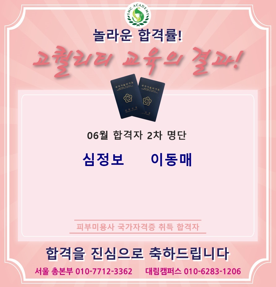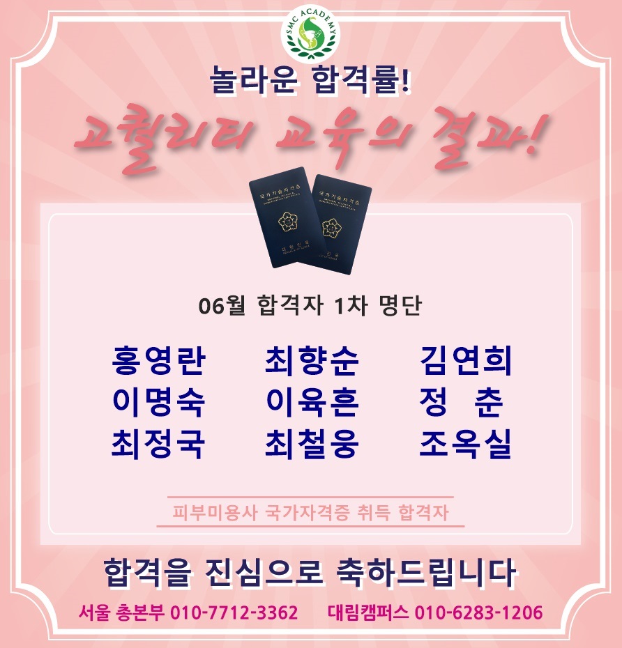 06월 피부미용 국가자격증 취득 합격자 명단 [놀라운 합격률!!]