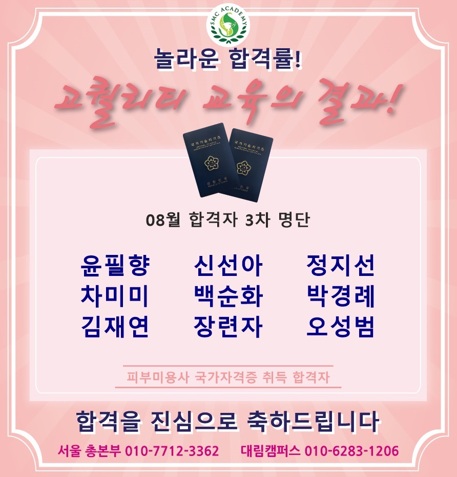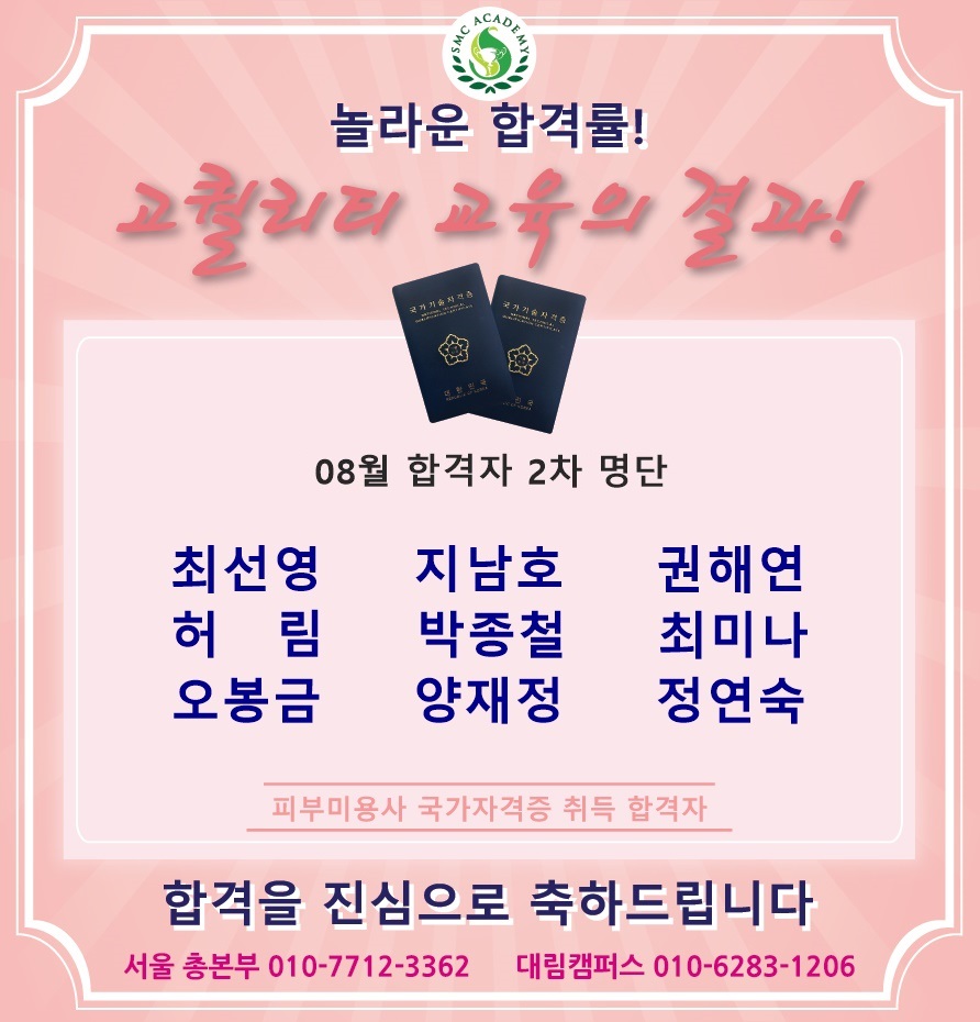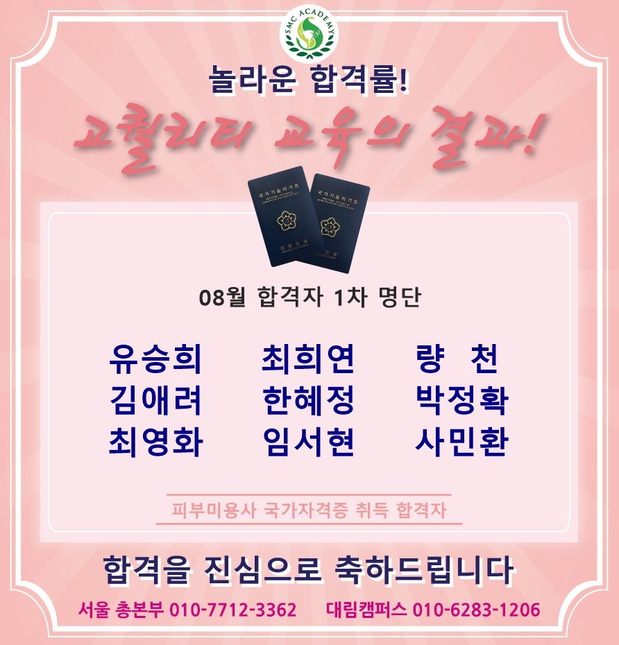 08월 피부미용 국가자격증 취득 합격자 명단 [놀라운 합격률!!]