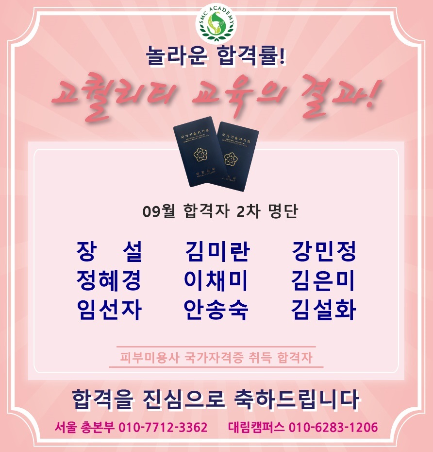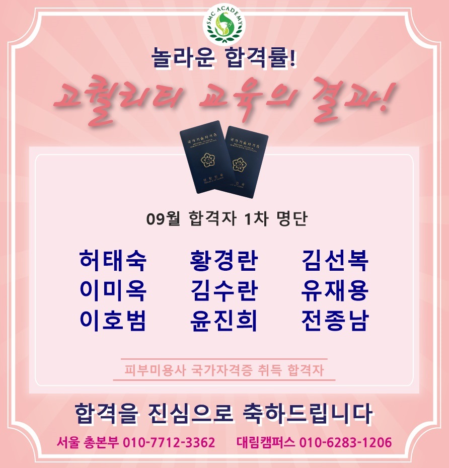 09월 피부미용 국가자격증 취득 합격자 명단 [놀라운 합격률!!]