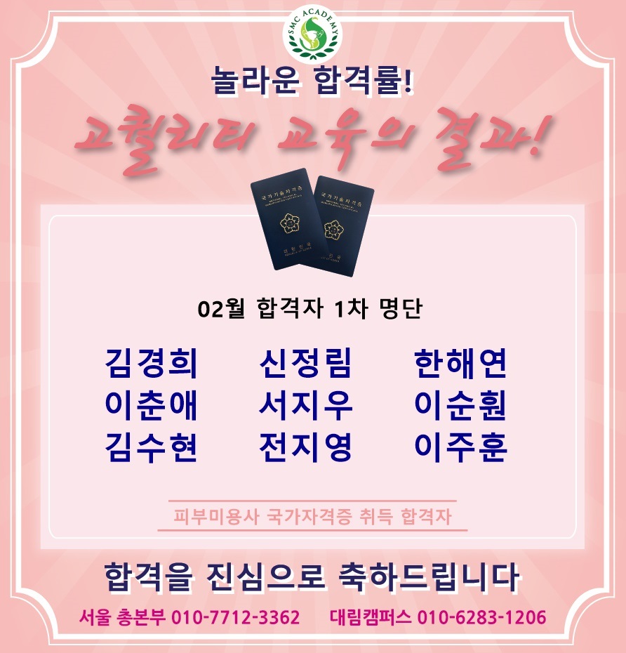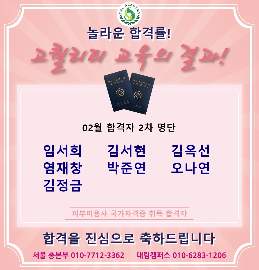02월 피부미용 국가자격증 취득 합격자 명단 [놀라운 합격률!!]
