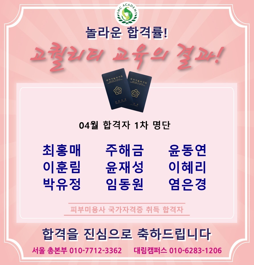 04월 피부미용 국가자격증 취득 합격자 명단 [놀라운 합격률!!]