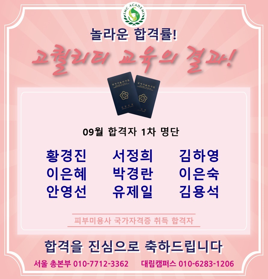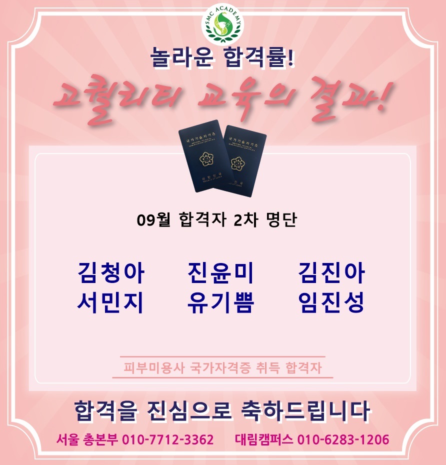 09월 피부미용 국가자격증 취득 합격자 명단 [놀라운 합격률!!]