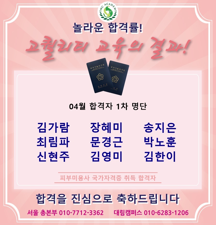04월 피부미용 국가자격증 취득 합격자 명단 [놀라운 합격률!!]