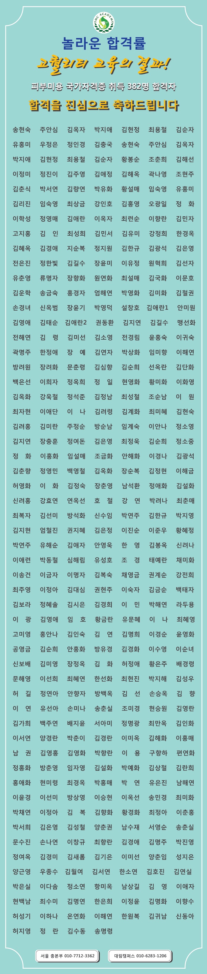 SMC아카데미 피부미용 국가자격증 취득 382명 합격자 명단