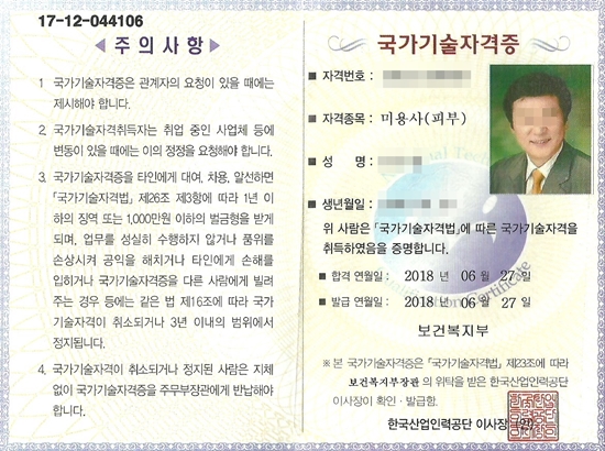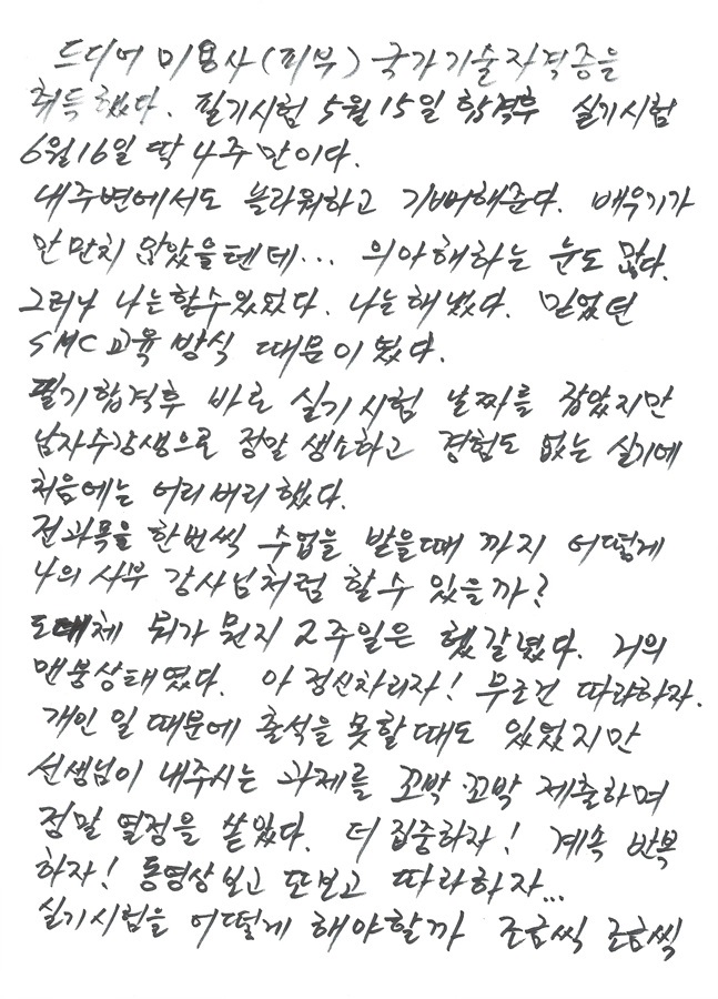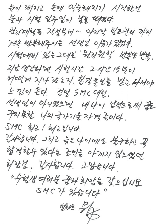 드디어 미용사(피부) 국가기술자격증을 취득했다. 필기시험 5월 15일 합격 후 실기시험 6월 16일 딱 4주만이다. 내 주변에서도 놀라워하고 기뻐해준다. 배우기가 만만치 않았을텐데... 의아해하는 눈도 많다. 그러나 나는 할 수 있었다. 나는 해냈다. 믿었던 SMC교육방식 때문이었다. 필기 합격 후 바로 길기시험 날짜를 잡았지만 남자수강생으로 정말 생소하고 경험도 없는 실기에 처음에는 어리버리했다. 전 과목을 한번씩 수업을 받을 때까지 어떻게 나의 사부 강사님처럼 할 수 있을까? 도대체 뭐가 뭔지 2주일은 헷갈렸다. 거의 멘붕상태였다. 아 정신차리자! 무조건 따라하자. 개인 일 때문에 출석을 못할 때도 있었지만 선생님이 내주시는 과제를 꼬박 꼬박 제출하며 정말 열정을 쏟았다. 더 집중하자! 계속 반복하자! 동영상을 보고 또 보고 따라하자... 실기시험을 어떻게 해야할까 조금씩 조금씩 눈이 떠지고 손에 익숙해지기 시작한 건 불과 시험 일주일이 남을 때였다. 관리계획표 작성부터~ 마지막 림프관리까지 계속 반복해주시는 선생님 이유가 있었다. 시험대비 '있는 그대로', '원리원칙', 반복 또 반복. 지금 생각하면 시험시간 2시간 15분이 어떻게 지나갔는지. 합격 통보를 받고 나서야 느낌이 온다. 정말 SMC 대림, 선생님이 아니였으면 내 나이 남성으로써 꿈도 꾸지 못할 나의 국가기술자격증이다. SMC 최고! 최고입니다. 감사합니다. 그리고 늦은 나이에도 불구하고 꼭 합격할 수 있다는 조언을 아끼지 않으셨던 협회장님, 감사합니다. 고맙습니다. "수험생 여러분 꿈과 희망을 갖으십시요. SMC가 있습니다" - 탤랜트 문수종 -
