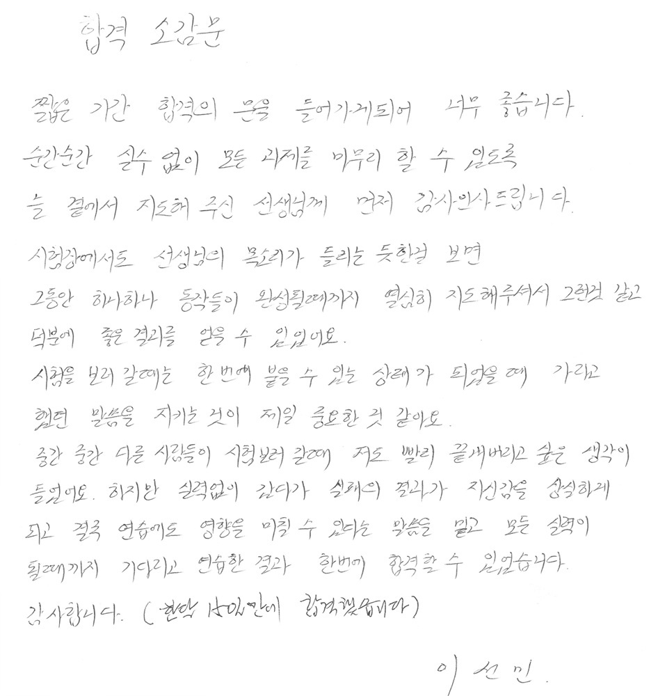 짧은 기간 합격의 문을 들어가게되어 너무 좋습니다.