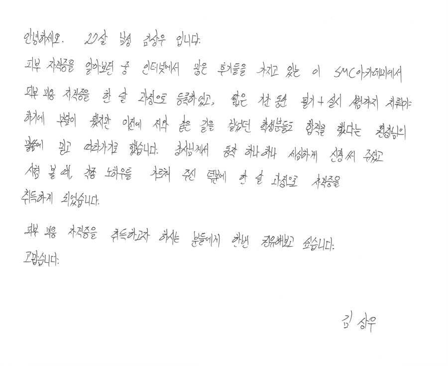 속성합격! 한달내에 국가자격증 취득, 김상우님! 피부국가자격증 후기자필