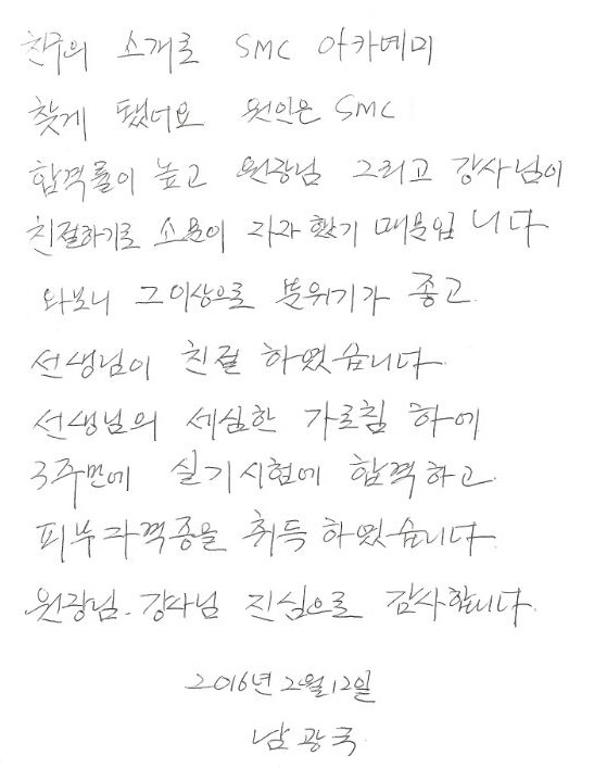 | 합격!! 실기 3주 배워서 국가자격증취득 남광국님!! ◆ [친구소개로 오신분~] | |