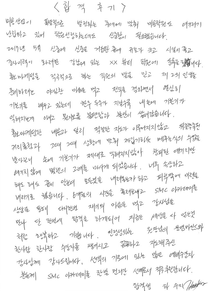 강사 이력이 화려한 강남에 있는 xx뷰티 학원에 등록을 했습니다.
