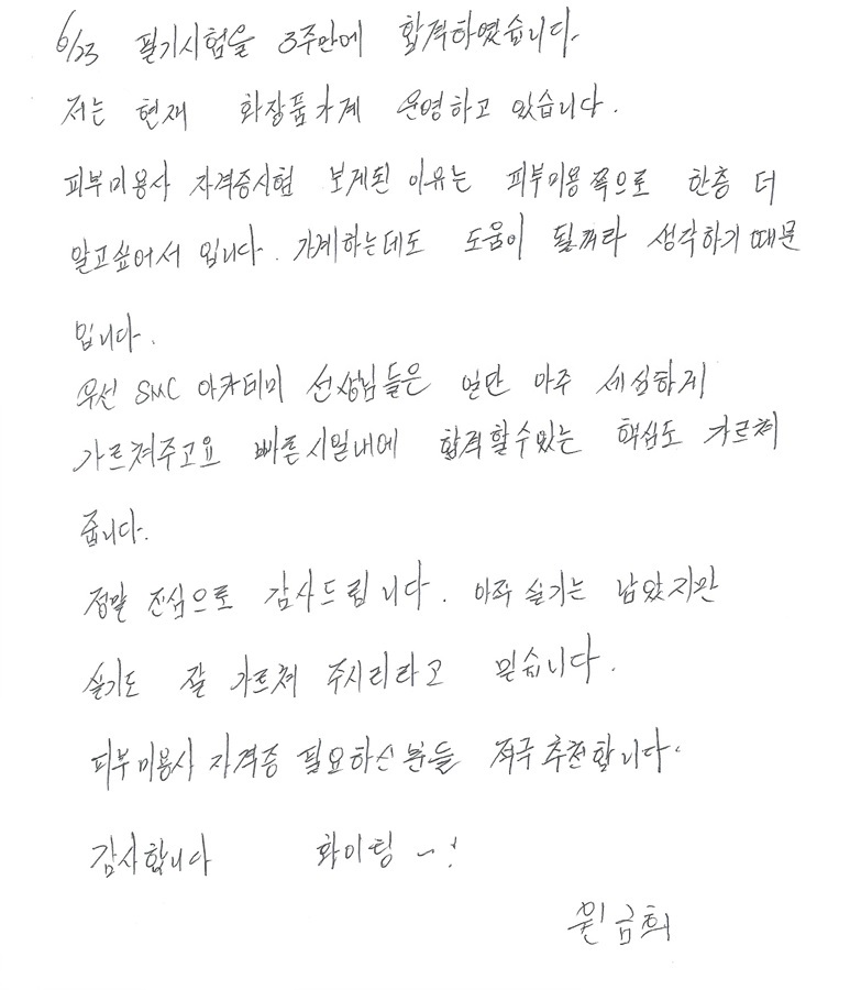 피부미용사 국가자격증 필기시험속성 합격후기!! 원금희님 3주만에 합격!!