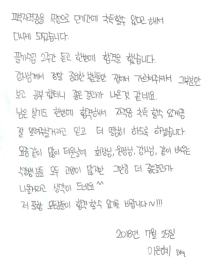 피부미용사 국가자격증 필기시험속성 합격후기!! 이은혜님 14일만에합격!!