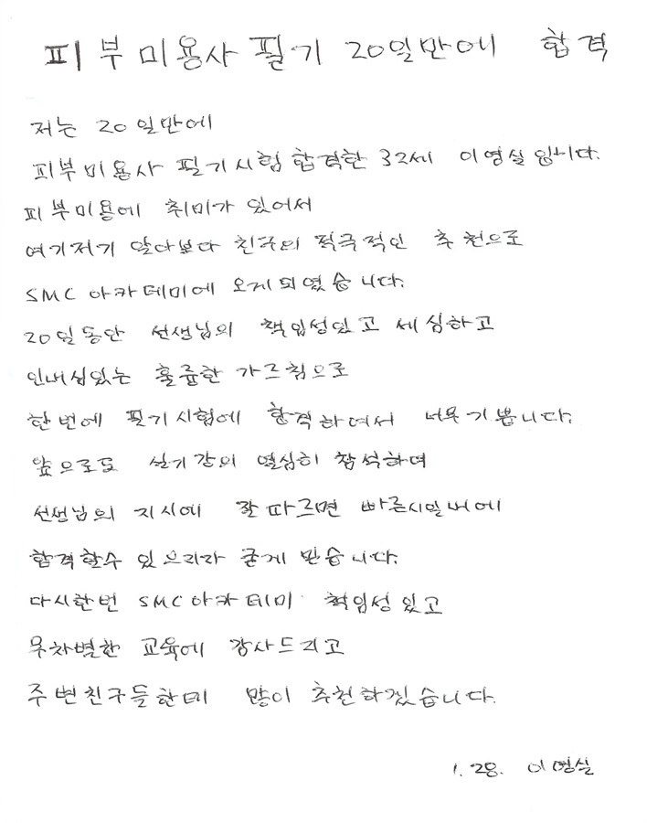피부미용사 국가자격증 필기시험 속성합격후기!! 이영실님 20일만에 합격!!