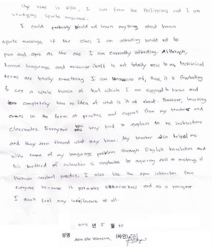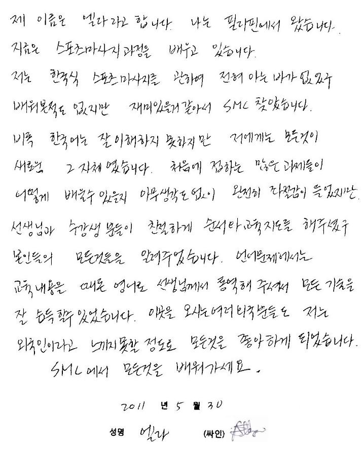 I'm from the Philippines. South Korea to massage you going to learn the job