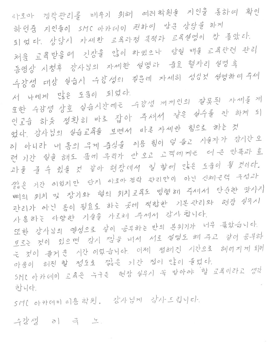| 개개인의 잘못된 자세까지 개인교습하듯 정확히 잡는- 이국노님! 피부관리사 수강후기자필 | |