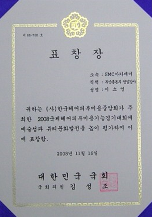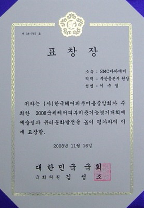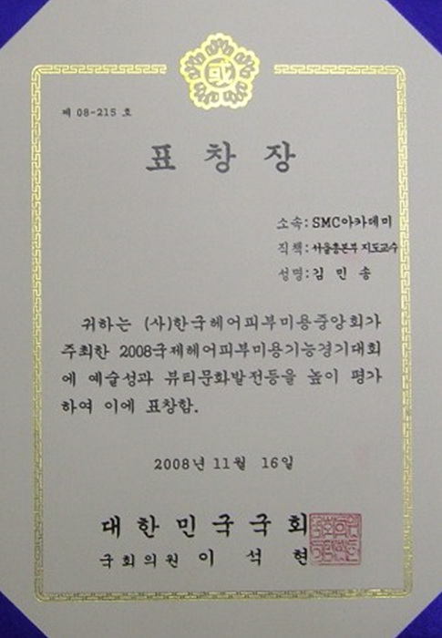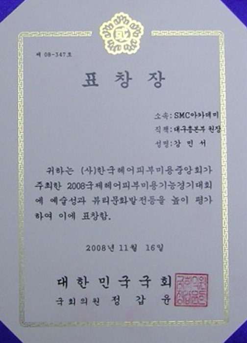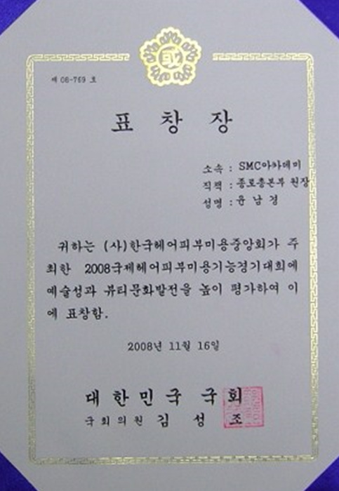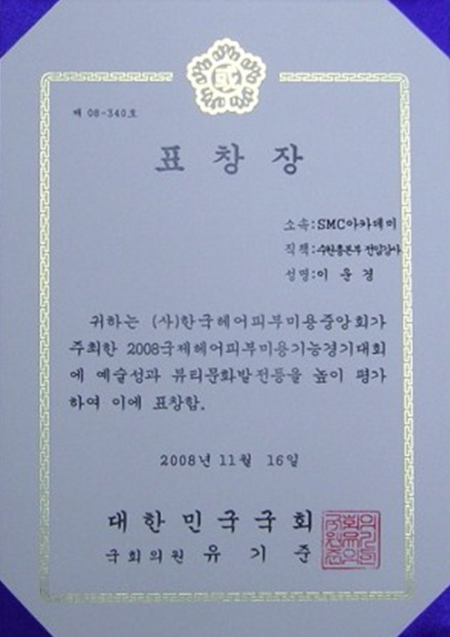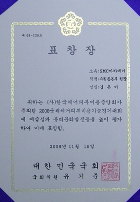 국제 피부미용대회 대한민국 국회 표창장 수상 소속 SMC아카데미